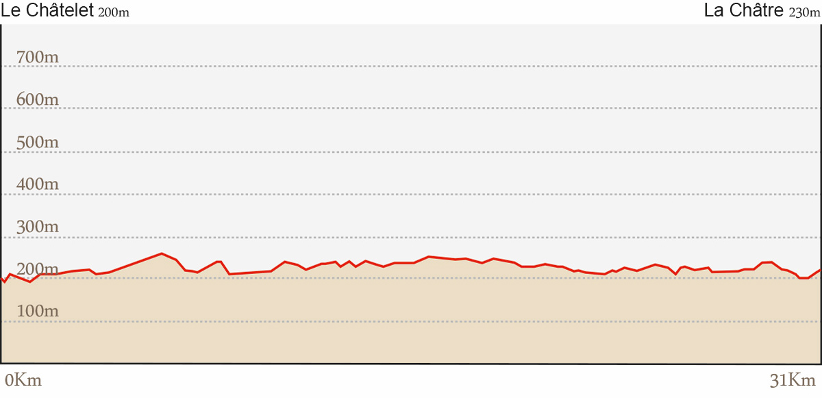 Encore une longue étape proposée de 31 km qui nécessitera 7 h 45 de pérégrination passant par Saint-Jeanvrin (7 km), Châteaumeillant (12,6 km) Néret (17,2 km) et Lacs (27,3 km) avant d'atteindre le terme de l'étape à La Châtre.
